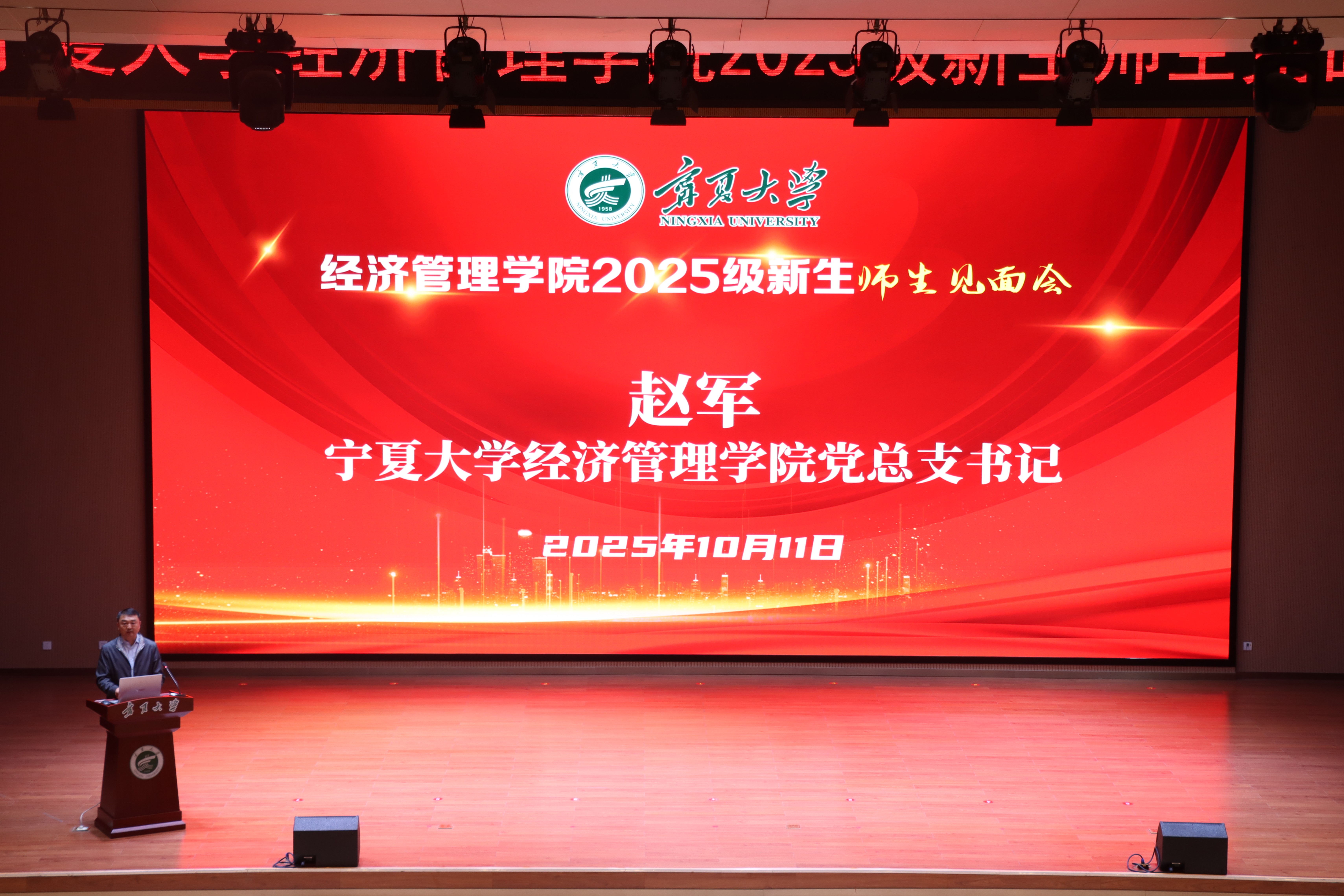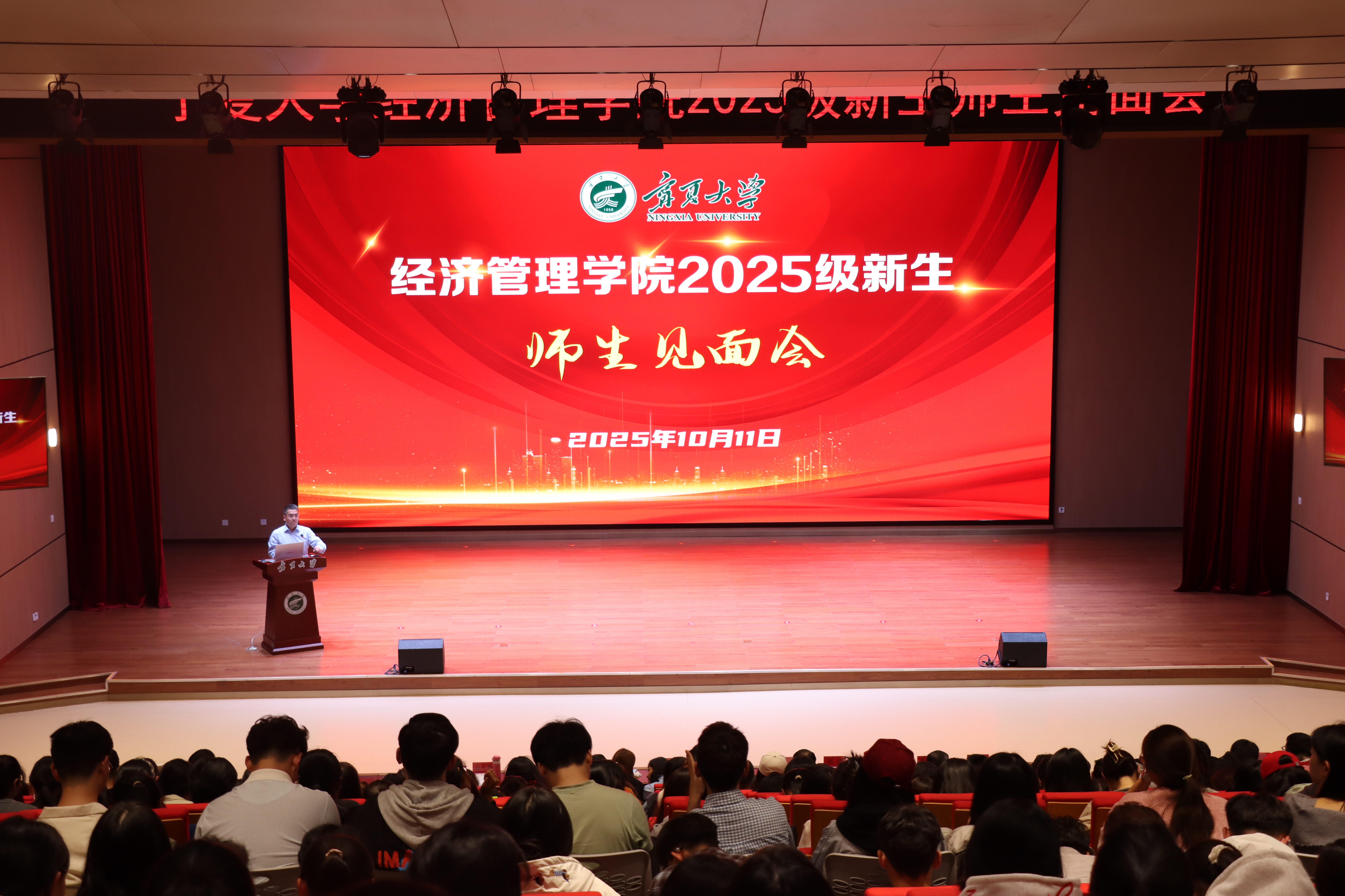 2025年10月11日下午,宁夏大学经济管理学院2025级新生见面会在笃行楼一楼报告厅顺利举行。宁夏大学经济管理学院党总支书记赵军,党总支副书记、院长杨国涛,副书记、副院长仇娟东,副院长康凌翔,经济学系书记刘涛,经济学系主任王若溪,工商管理系书记付森,工商管理系主任张淑萍,会计学系书记虎兴武,会计学系主任陈军梅,农林经济管理系书记王琳瑛,农林经济管理系主任东梅,工商管理学学位点负责人朱丽娅,研究生导师代表樊新刚,经济管理学院研究生事务主管马赫然,2025级经济学班班主任李鸿雁,2025级金融学班班主任哈梅芳,2025级工商管理1班班主任仉瑞,2025级工商管理2班班主任王娟,2025级工商管理3班班主任李键,2025级会计学班班主任方晨力,2025级农林经济管理班班主任杨钰莹,经济管理学院英国高等教育文凭项目主管、工商管理(AD)班班主任杨景,2025级会计学(AD)班班主任高冬鹤以及2025级全体本科生和全日制硕士研究生参与本次见面会。活动由仇娟东副书记、副院长主持。