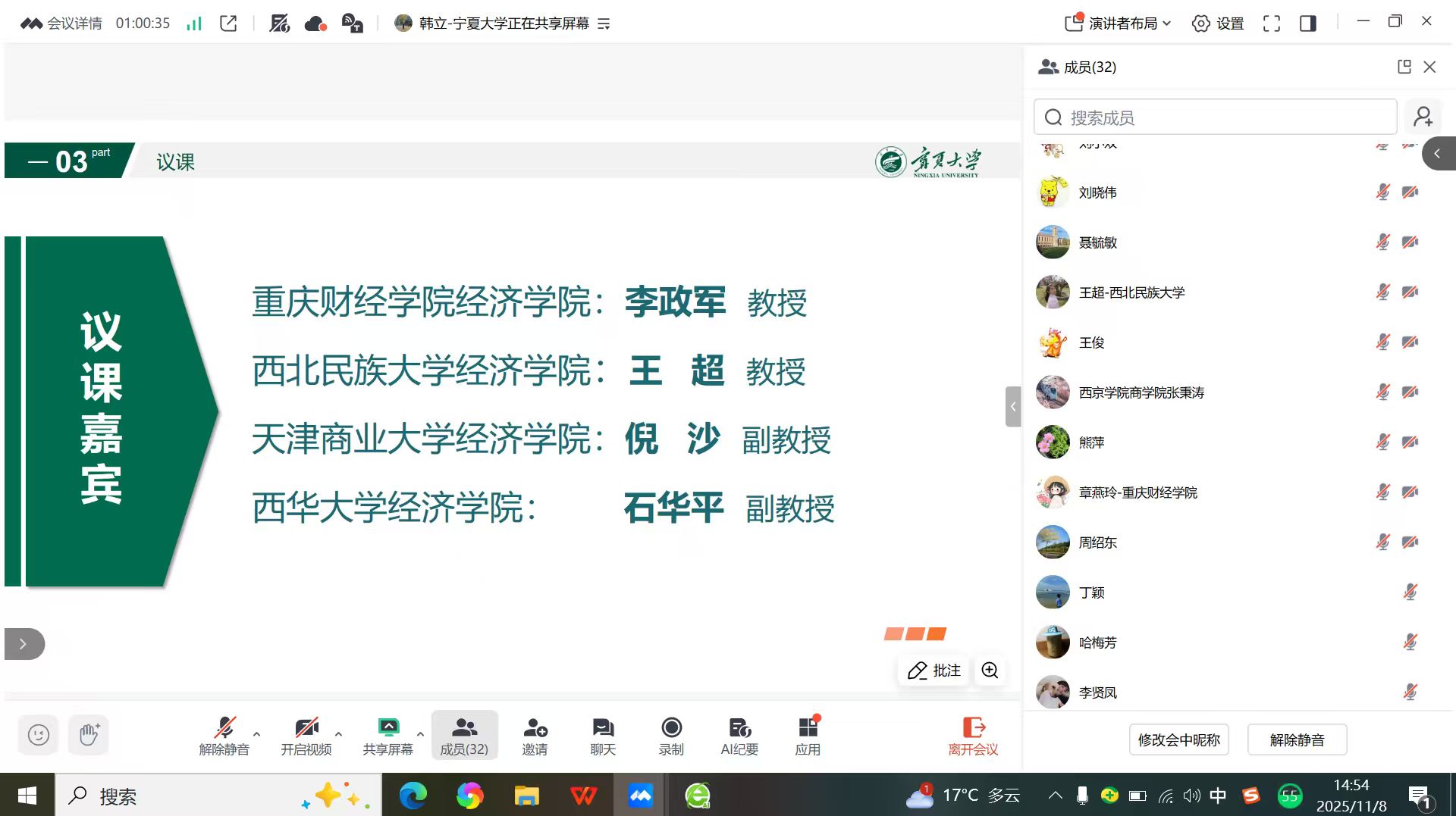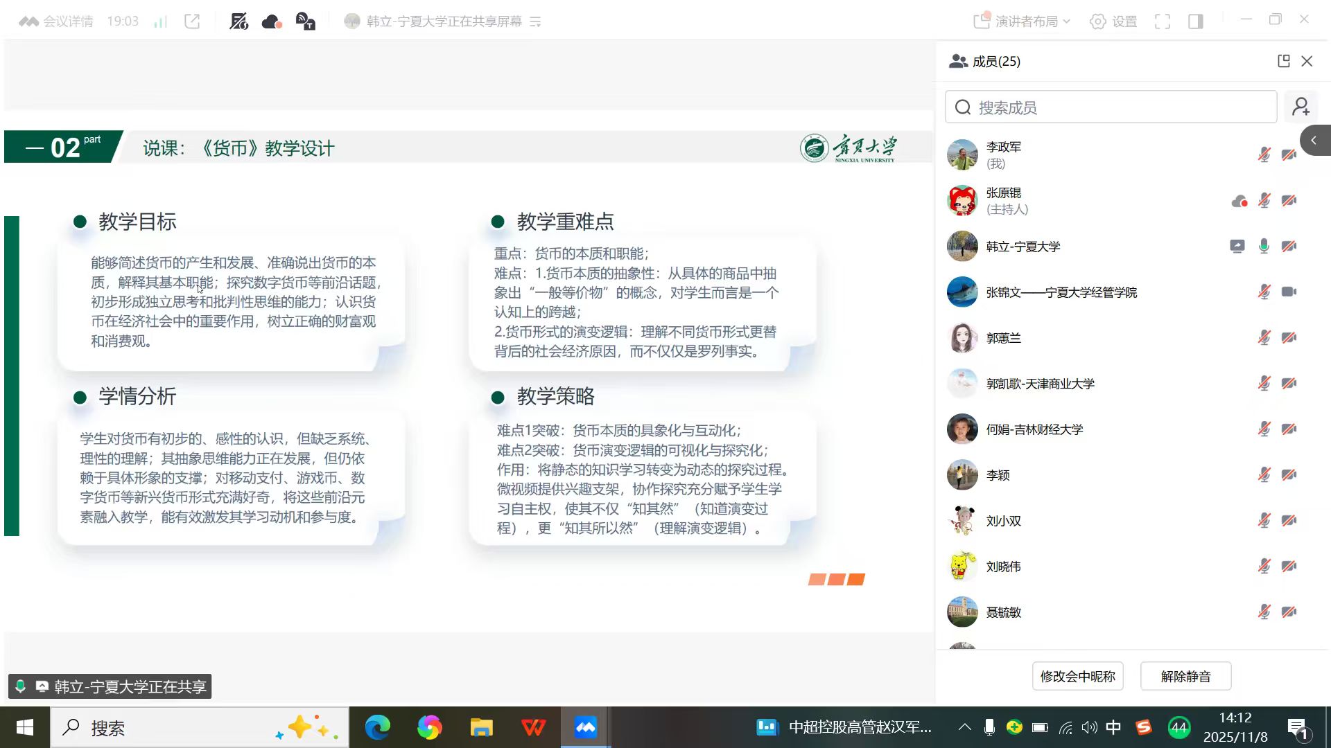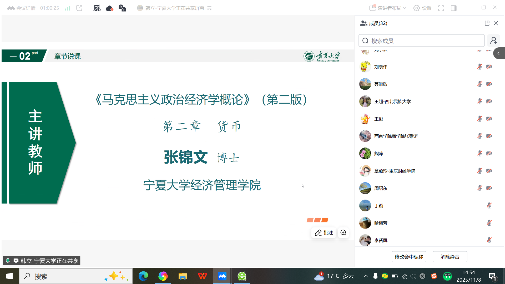 11月8日下午,由宁夏大学经济管理学院《政治经济学》课程团队承担的政治经济学课程教学联盟第三次集体备课会如期举行。会议由课程团队负责人韩立教授主持,来自宁夏大学、重庆财经学院、天津财经大学等10余所高校32名从事《政治经济学》课程教学的老中青教师齐聚线上,共同就“货币”问题展开交流讨论。杨国涛院长代表学院致辞,强调了政治经济学课程的重要性和教学研讨的必要性,也提出了“教而不研则浅,研而不教则空”的建议和要求。