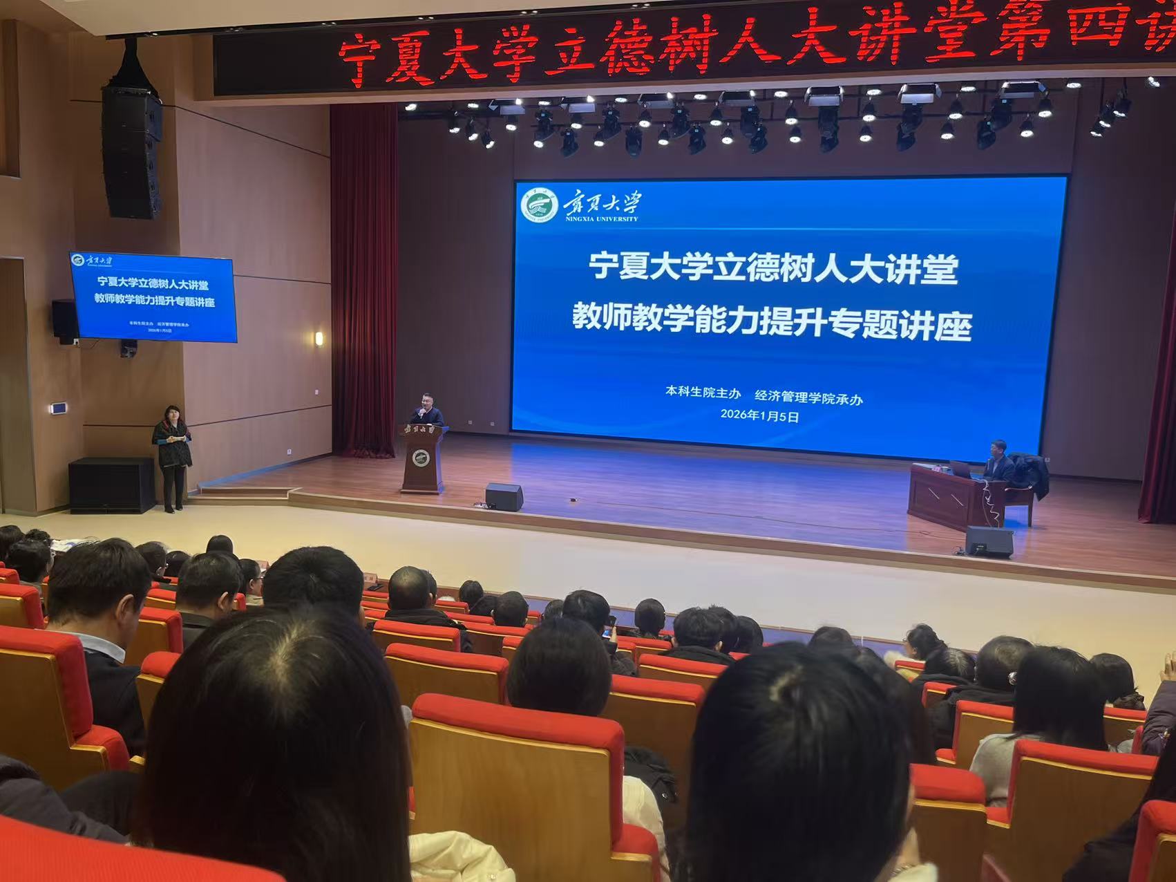 2026年1月5日下午,宁夏大学经济管理学院在笃行楼一楼报告厅成功承办了宁夏大学立德树人大讲堂第四讲。本次讲座特邀北方民族大学教师教学发展培训师、硕士生导师蒋亮做题为《人工智能在课程教学中的应用与实践》的专题报告。蒋亮老师作为国家级一流课程和省级课程思政示范课程负责人、教育部一流课程评审专家、超星智慧教学研究院特聘专家,先后荣获第三届全国高校教师教学创新大赛二等奖、国家民委青年教学标兵和省级课程思政教学名师称号,其教学课程案例入选首批全国高校智慧课程最佳案例和“新质·引领·赋能”首届数字教育示范标杆案例。讲座围绕教师数字素养提升、智慧课程建设、AI大模型及工具应用等前沿议题展开,吸引了来自全校各学院的数百名教师代表积极参与。